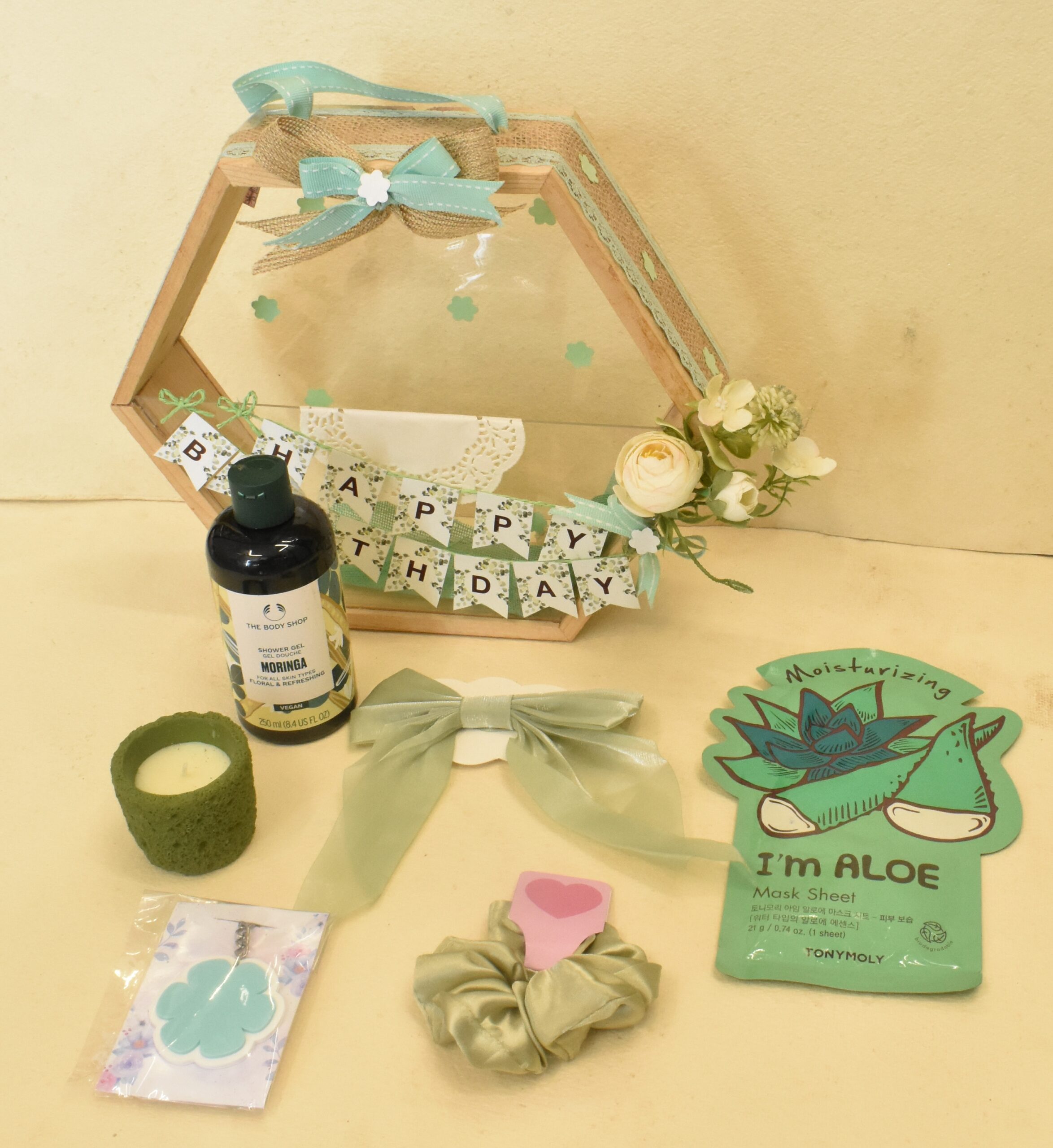 Thoughtfully put together, it includes a trendy bow hair clip, a soft scrunchie, a rejuvenating sheet mask, a premium shower gel from The Body Shop, and a fragrant candle to set the perfect relaxing vibe. Every element is chosen to create a calming, pampering experience—making it more than just a gift, but a moment of indulgence.